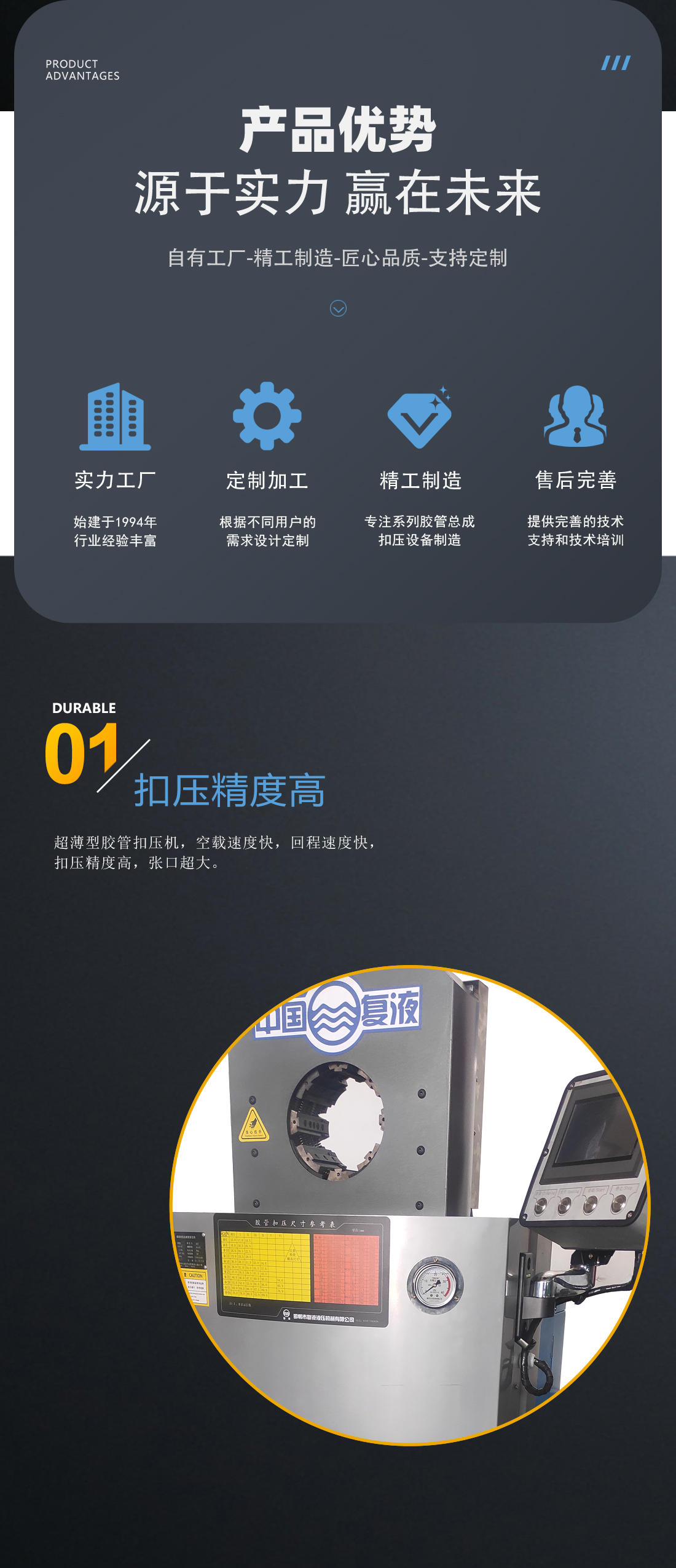 Our company has successfully developed an ultra-thin series of pipe shrinking machines, with a repeated compression accuracy of 0.1mm. The ultra-thin structural form overcomes the inherent shortcomings of traditional circular buckle press, and can easily buckle high-pressure oil pipe assemblies and special-shaped flexible shaft hoses with complex shapes. This machine has a smaller exterior size and adopts a user-friendly design, making it more convenient for users to operate. The control system adopts a PLC+display screen mode, and the displacement sensor can collect signals with an accuracy of 0.01 millimeters. The system can adopt three modes: manual, semi-automatic, and fully automatic. Users can easily choose according to the actual processing conditions, greatly improving processing efficiency. If you encounter any inconvenience during your use, please contact us in a timely manner. We will make unremitting efforts to improve the quality of your products and work efficiency.